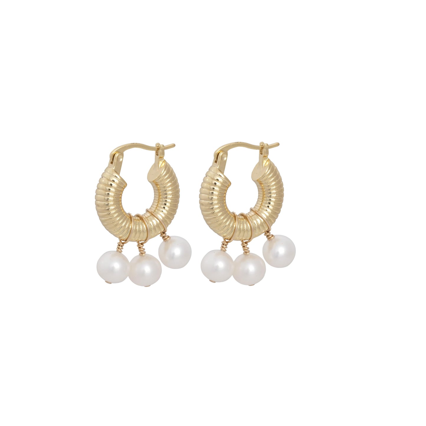Ring earrings made of 14K Gold Plated Brass with lines pattern and 3 pearls